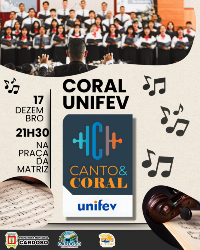 A Prefeitura Municipal de Cardoso, por meio da Secretaria Municipal de Turismo, convida toda a população para uma linda apresentação do Coral UNIFEV – Canto & Coral!